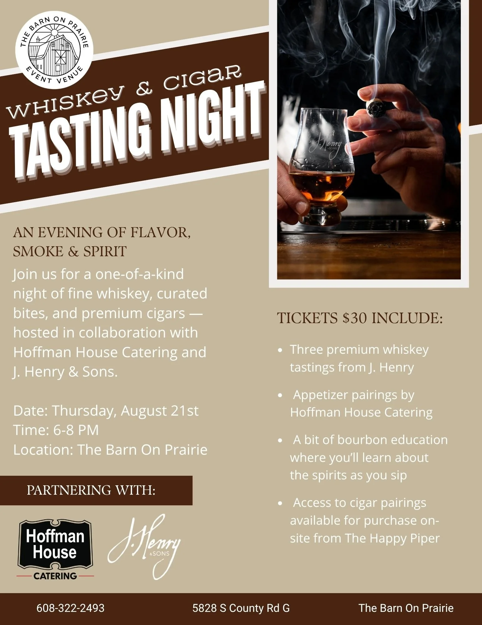 Join us for a one-of-a-kind night of fine whiskey, curated bites, and premium cigars — hosted in collaboration with Hoffman House Catering and J. Henry & Sons.
